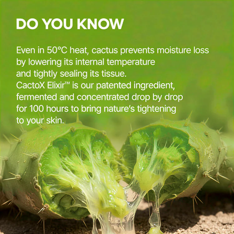 At the heart of the formula is Cactox Elixir®, a patented cactus extract fermented for 100 hours to enhance moisture retention and natural firming performance.