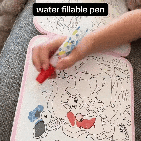 Each page is coated with a special reusable surface. Simply fill the included pen with water and brush it over the page — hidden colors appear like magic. As the page dries, the colors fade so your child can paint again and again.